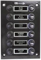 Black Bakelite switch panels as detailed above complete with switches that have weatherproof black neoprene boots. An improvement over standard switch panels for little additional cost. These panels are fully wired for use, include screw in fuse holders with 5 amp fuses and assorted stick on name labels Suits 12 and 24 volt. 04/15