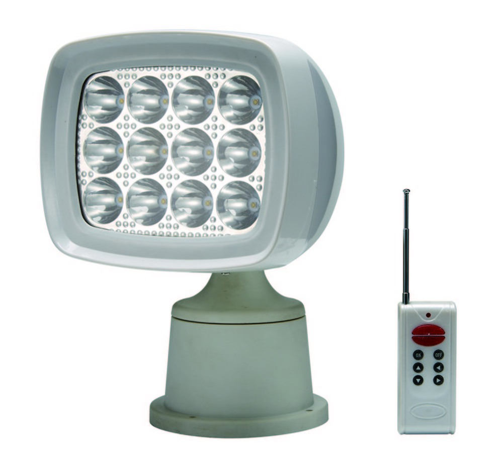 Remote control searchlight with very brigh 1600 Lumen light output. Includes 12 x 3 watt cool white Hi-Power LED's and a special reflector giving a total light output of 1600 Lumens for night piercing performance and energy efficiency.