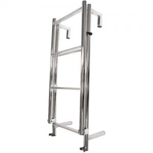 A 6 rung folding stainless steel removable ladder designed specifically for mounting over the toe rail of yachts. Black plastic plugs on top and bottom of mounting legs for soft mounting against the hull. Short 90 degree bend on top mounting to fit over the toe rail.