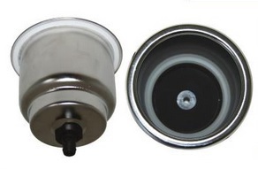 Polished stainlesss steel recessed mount drink holder complete with under flange mounting gasket, PVC base inside the holder and a 10mm hose tail drain.