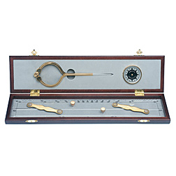 We have assembled our finest brass one-hand dividers, our deluxe brass arm parallel rules and now fitted with a 1-3/4" liquid filled brass compass in an elegant deep red mahogany finish wooden box that is fitted out with polished brass hardware. The box also accepts a brass plate (not included) suitable for engraving. Dims: 15-3/4"l x 3-3/4"w x 7/8"d.