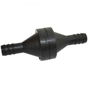 A compact, non-corrosive , plastic in-line check valve to prevent back surge (up to 100 PSI) in water pressure pump installations. Also ideal where a valve is required with pumps that do not self prime. Has 12mm barbed hose end connections. Total size 110 x 50mm