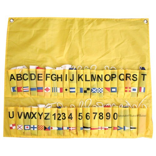 Complete set of 40 international code flags made from UV treated knitted polyester with reinforced polyester header and 3.5mm diameter nylon tie line. Supplied in roll-up storage bag. 26 x letters 300mm x 200mm