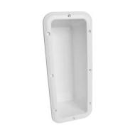White moulded box for recessed storage of a fire extinguisher. UV resistant white ABS plastic. The box flush mounts into a panel allowing storage, without the extinguisher protruding into a cabin area. Suits most standard 0.9 & 1kg fire extinguishers. 370 x 120mm inside.